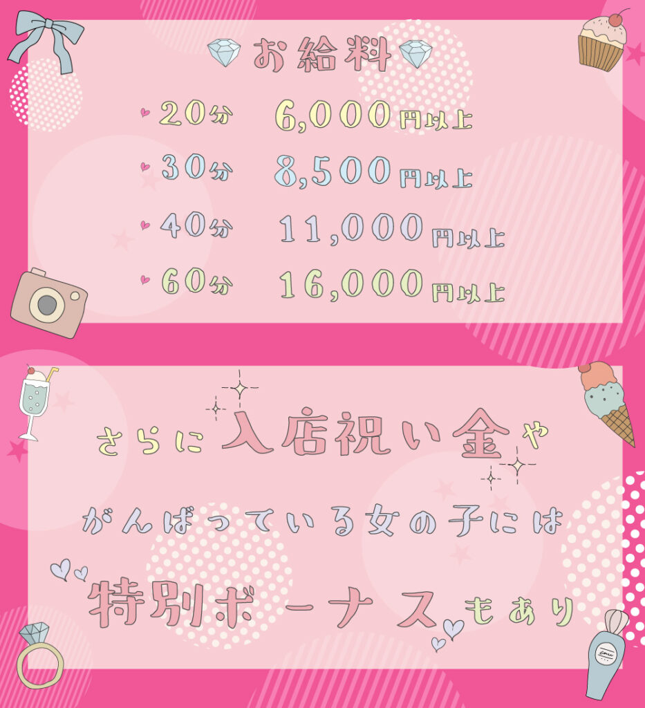 | お給料 | 20分 / 6,000円 30分 / 8,500円 40分 / 11,000円 60分 / 16,000円 |